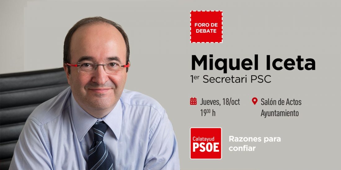 El próximo jueves, 18 de octubre, a las 19:30h, tendrá lugar un nuevo Foro de Debate del PSOE de Calatayud. En esta ocasión el debate versará sobre la situación política en Catalunya, con la compañía de Miquel Iceta, 1er Secretari del PSC.