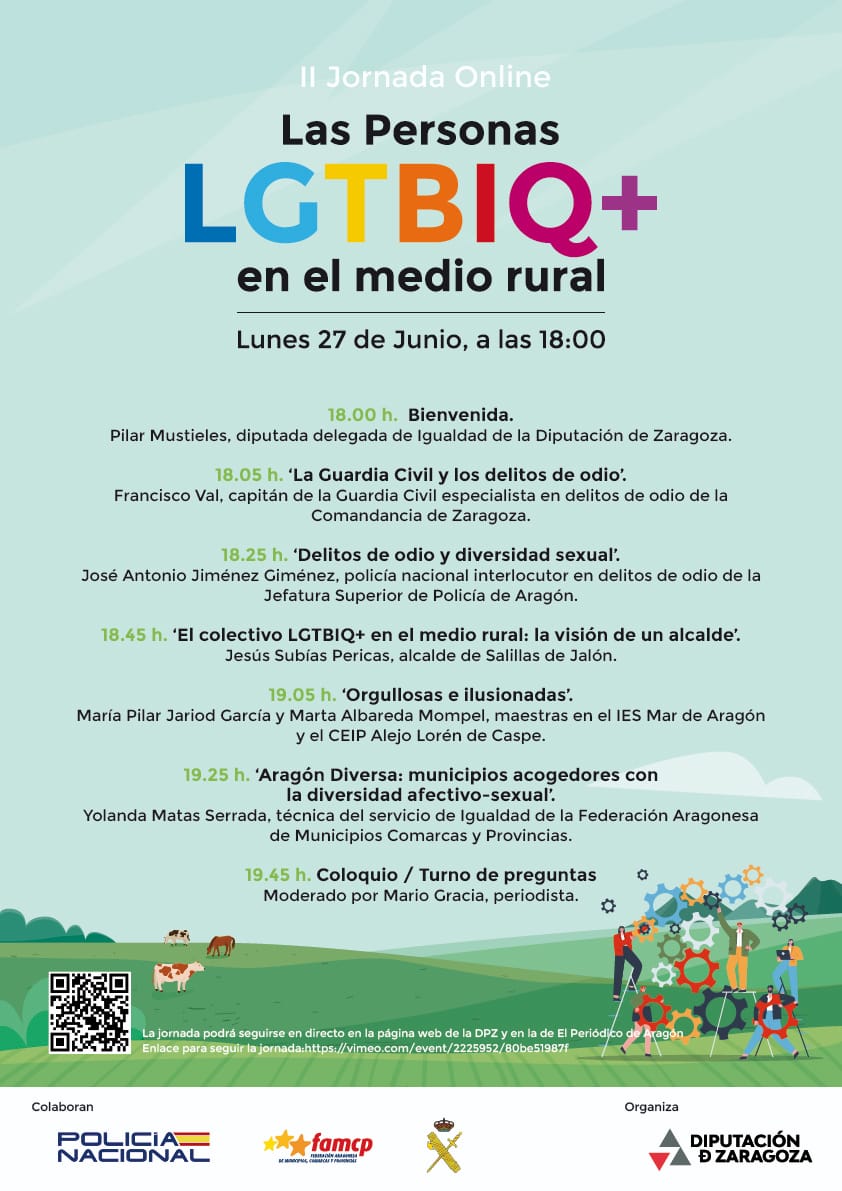 “La Diputación de Zaragoza tiene por bandera la igualdad, es esencial que las personas puedan ser libres, también en nuestro medio rural, para amar a quien deseen y para mostrar su orientación sexual sin prejuicios ni discriminación”, recalca la diputada delegada de Igualdad de la Diputación de Zaragoza, Pilar Mustieles. “Por eso hemos vuelto a organizar esta jornada que ya celebramos el año pasado y que tiene como objetivo debatir y reflexionar sobre la realidad del colectivo LGTBIQ+ en nuestros pueblos y hacerlo sin prejuicios ni ideas preconcebidas, huyendo de los tópicos en los que muchas veces caemos cuando hablamos del medio rural”.