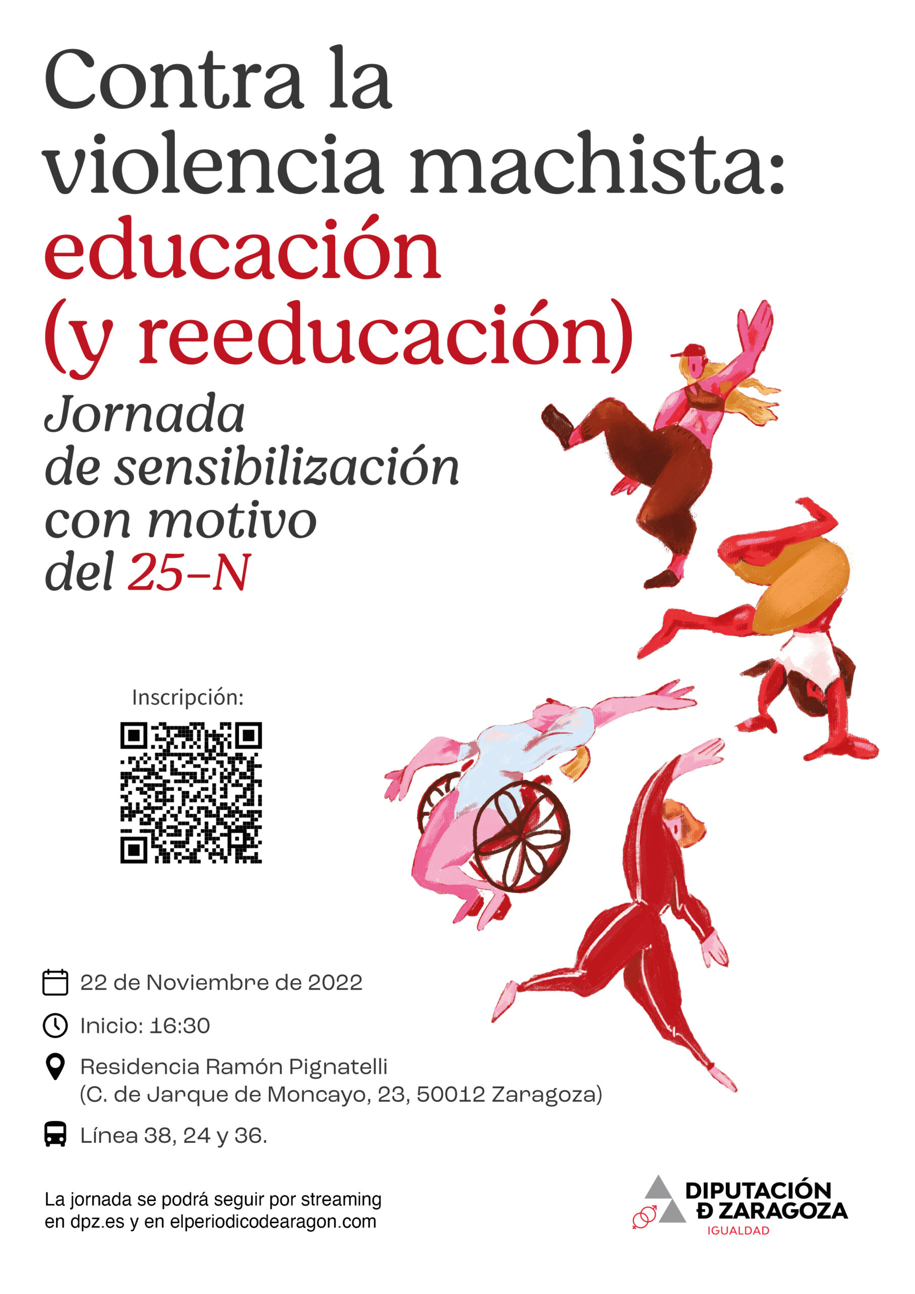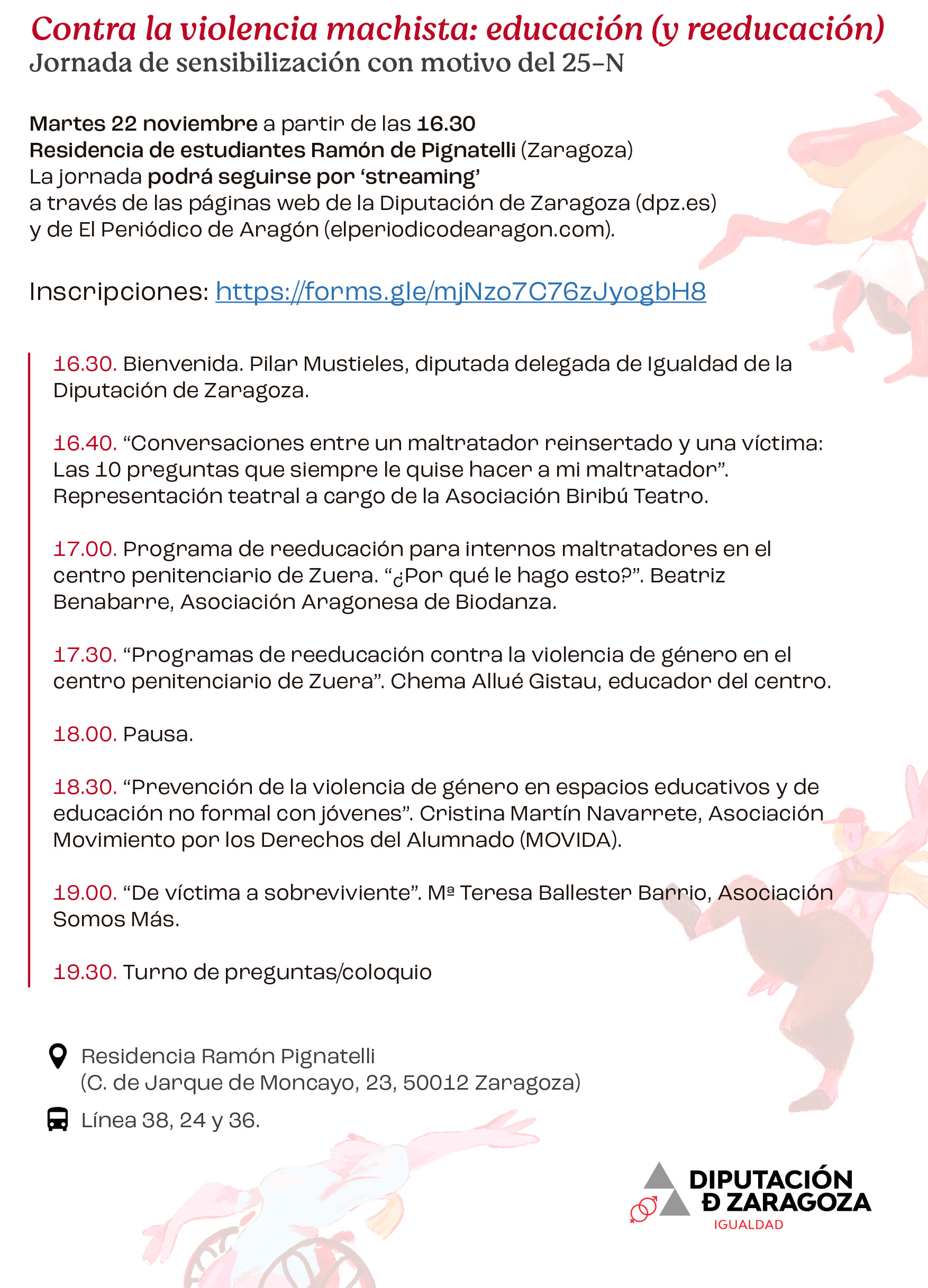 Zaragoza, 21 de noviembre de 2022.- La Diputación de Zaragoza se suma a la conmemoración del 25N, el Día Internacional de la Eliminación de la Violencia contra la Mujer, con un encuentro sobre distintos enfoques para combatir y prevenir esta lacra. La jornada ‘Contra la violencia machista: educación y reeducación’ se celebrará mañana martes, 22 de noviembre, en el salón de actos de la residencia de estudiantes Ramón de Pignatelli desde las 16.30. Los asistentes tienen que inscribirse rellenando un formulario, pero también podrá seguirse por ‘streaming’ a través de las páginas web de la Diputación de Zaragoza y de El Periódico de Aragón.
